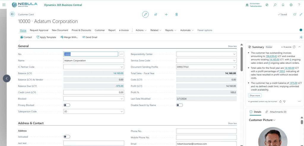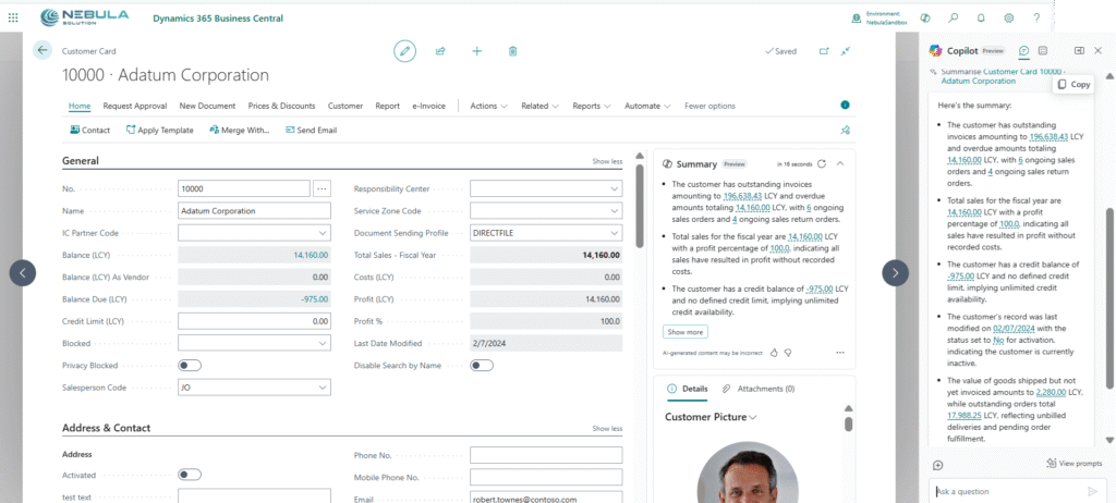 Use Copilot to get a quick summary of a record, such as a customer, item, or sales order, directly in the page’s FactBox pane. Copilot uses AI to generate two or three concise bullet points that provide details and insights about the data tailored to your role in Business Central. The summary helps you understand the data and identify areas that need attention. Interact with the summary to link to data sources and open related pages, so you can act on your data.