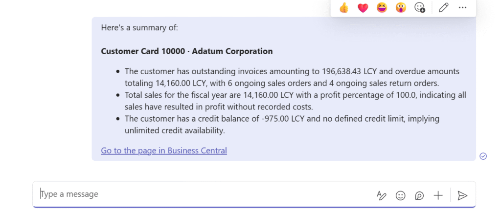 You can easily share any summary with your coworkers by using the Copy summary button, then pasting into your favorite app such as Microsoft Teams chats, Outlook emails, or in your project OneNote. Pasting a summary includes the summary bullet points and a link to the source page in Business Central that you can navigate to the full information.